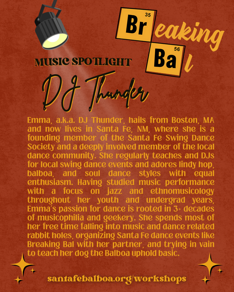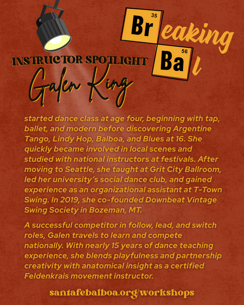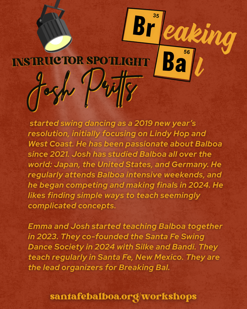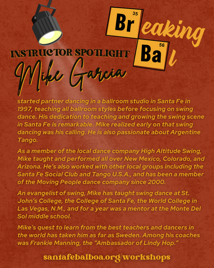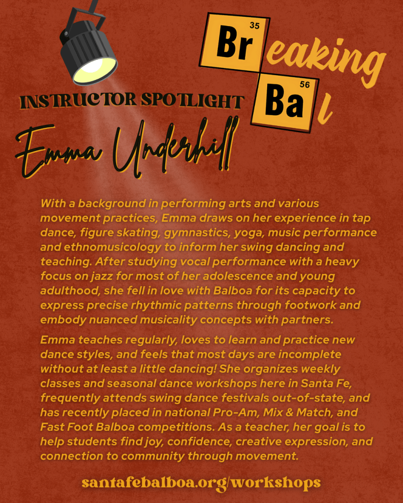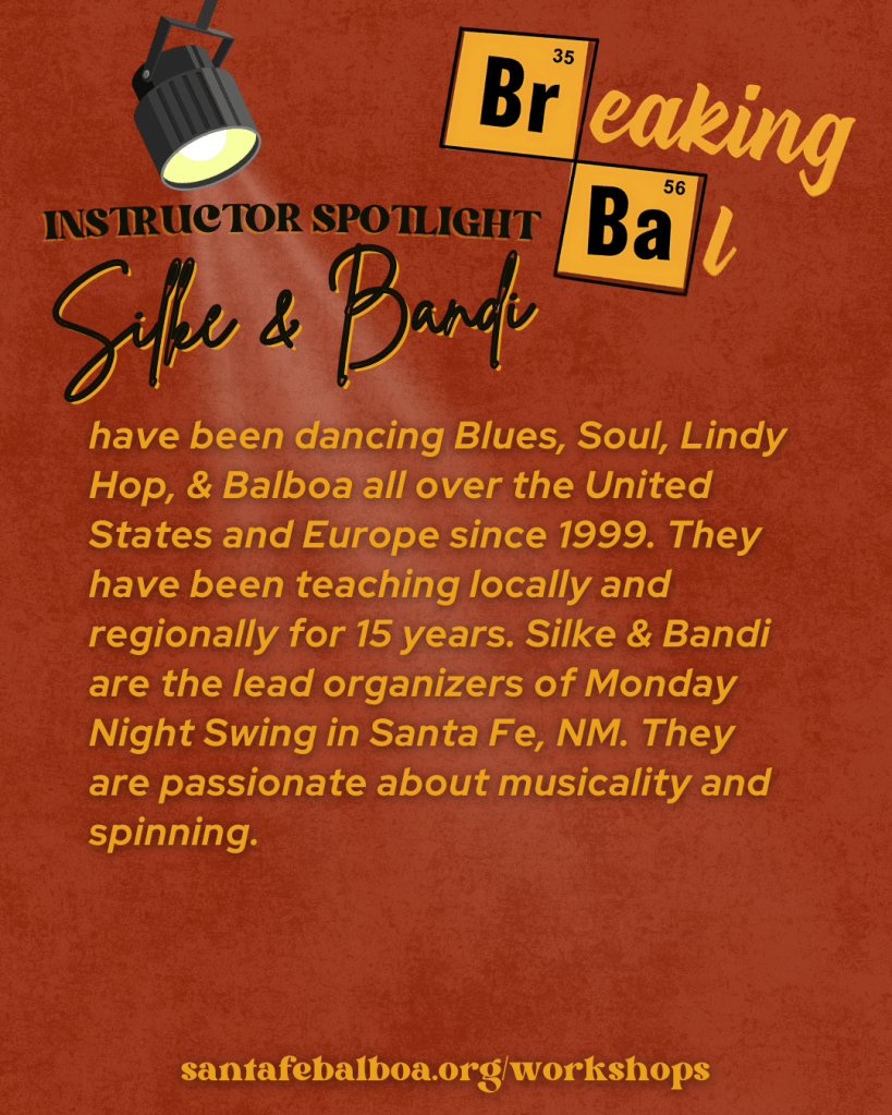 Breaking Bal, episode 2, was a swing and blues weekend in Santa Fe, New Mexico. The Santa Fe Swing Dance Society (SFSDS) was excited to welcome visiting instructors Desiree Roffers from Chicago, IL and Dominic Hanna from Raleigh, NC. There were workshop lessons, live music, and social dance parties for Balboa, Blues, and Lindy Hop dancers.