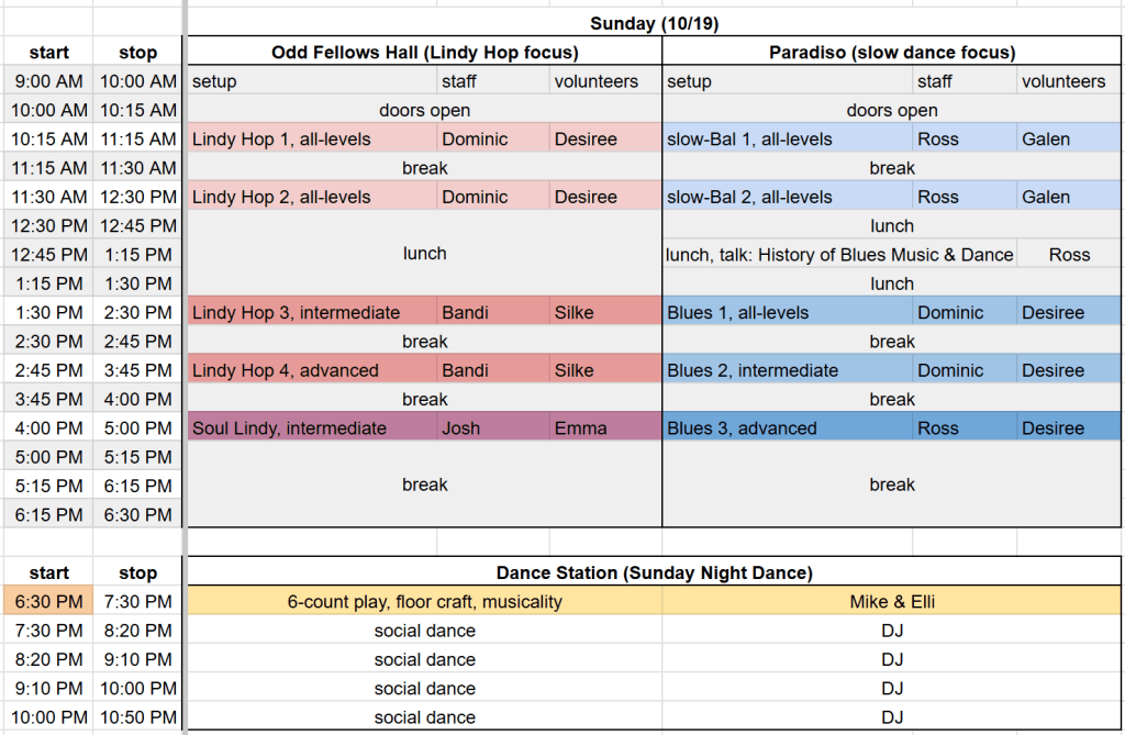 We offered 22 classes throughout the weekend with topics in Balboa, Blues, Lindy Hop, Charleston, Swing/Tango Fusion, Hip Hop, African Dance, Switching, and more! Read through the class descriptions to learn more.