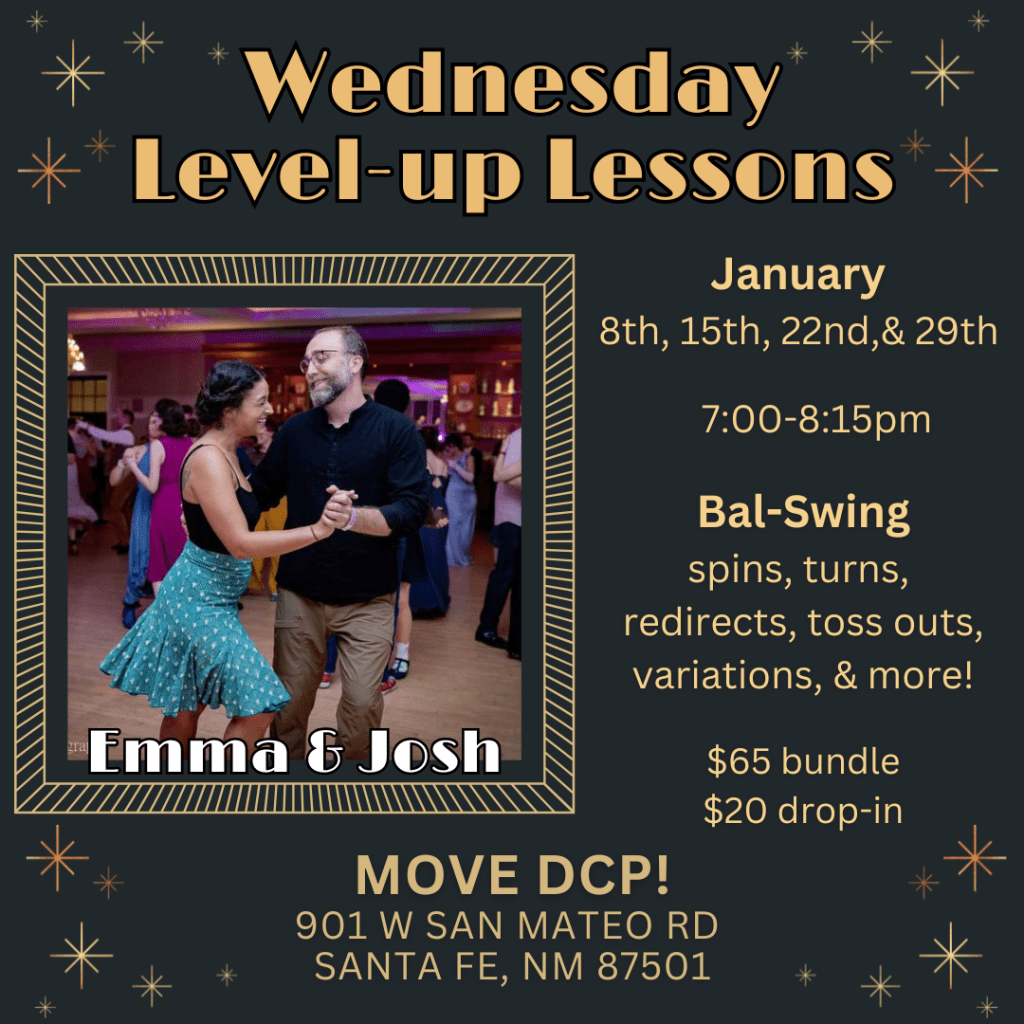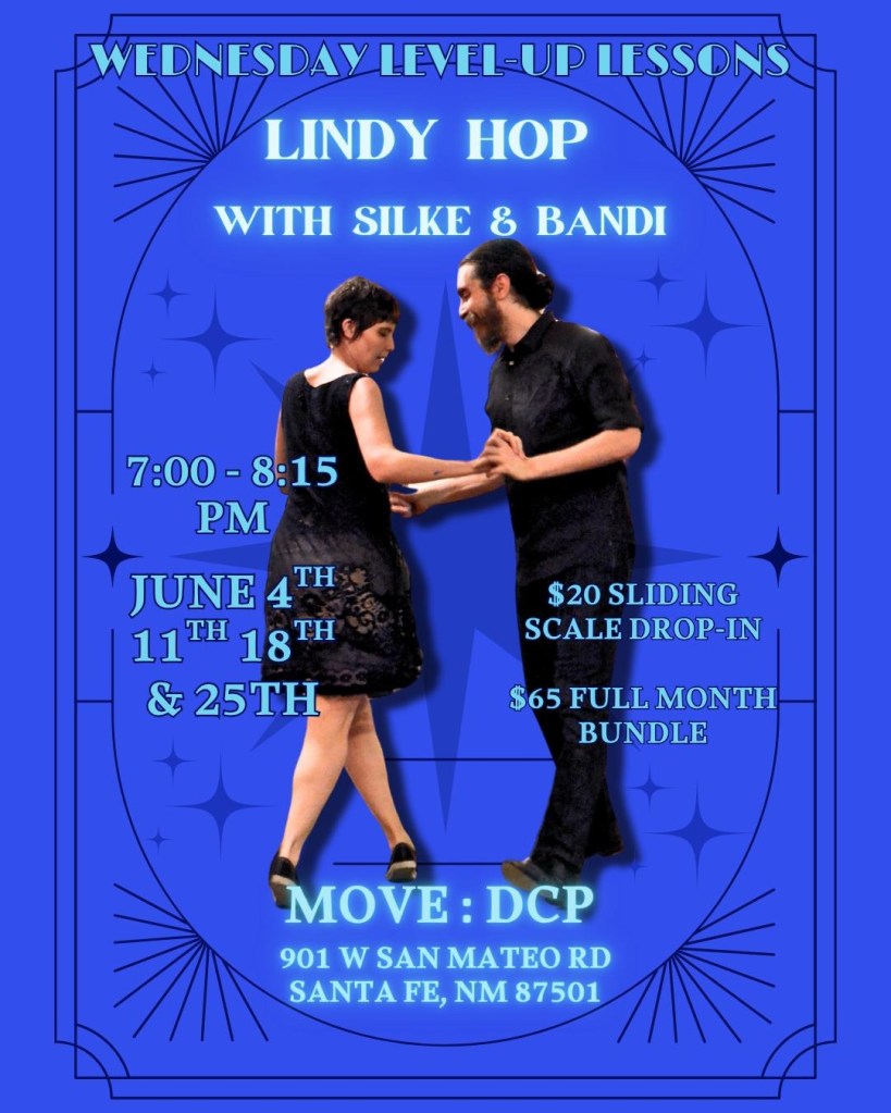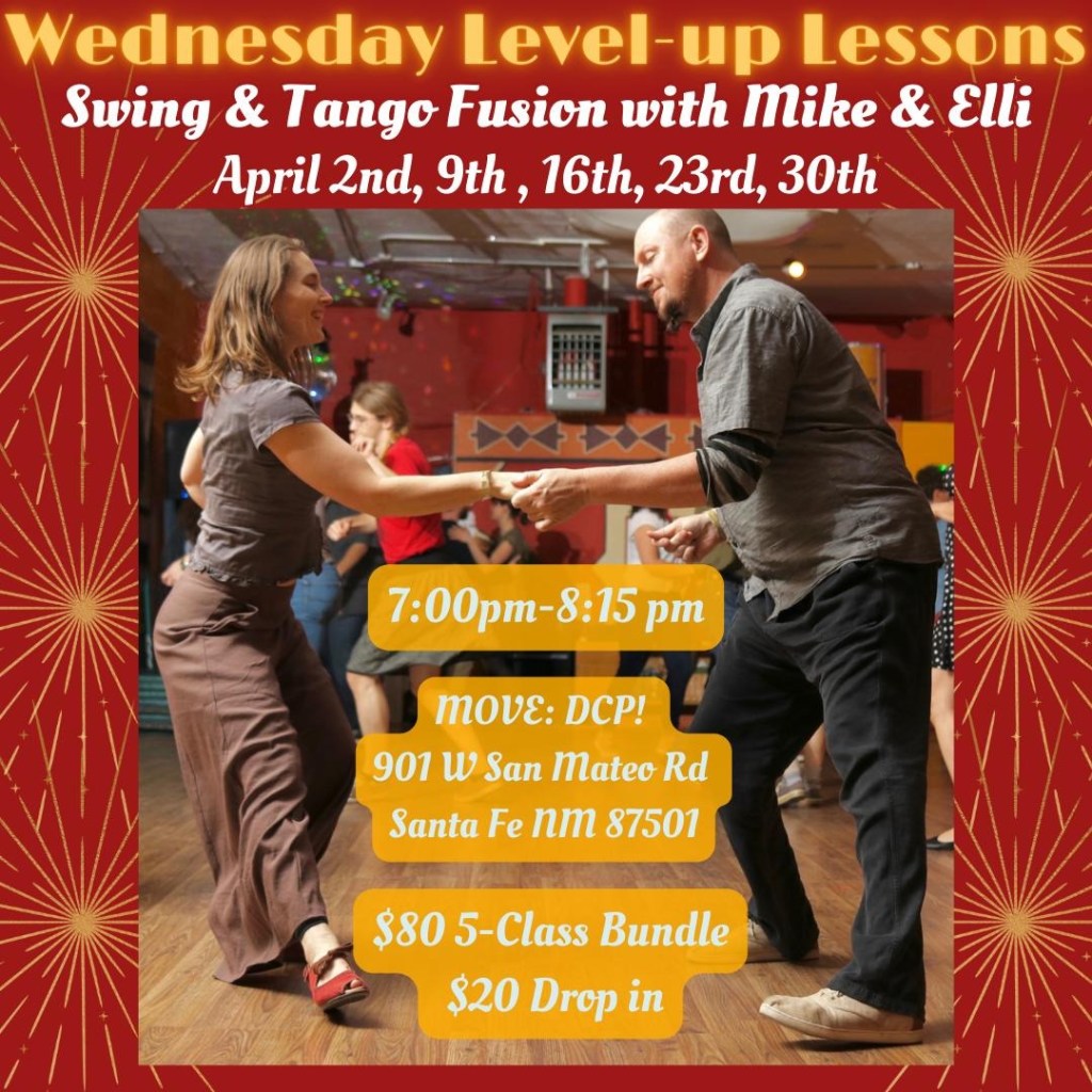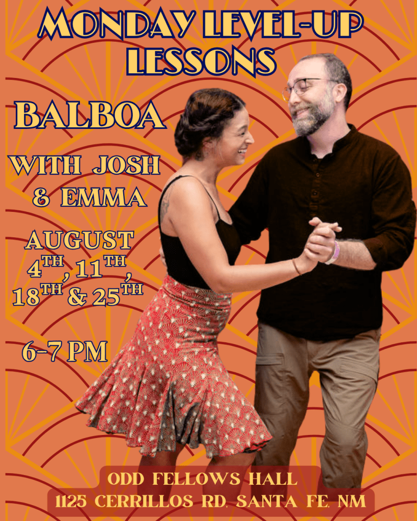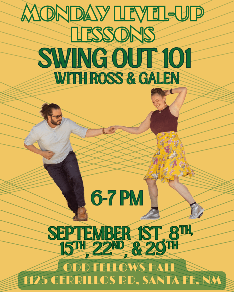 focus on intermediate & advanced swing dance topics. Lessons occur at 6PM at Odd Fellows Hall, 1125 Cerrillos Rd, Santa Fe, NM on Monday evenings.